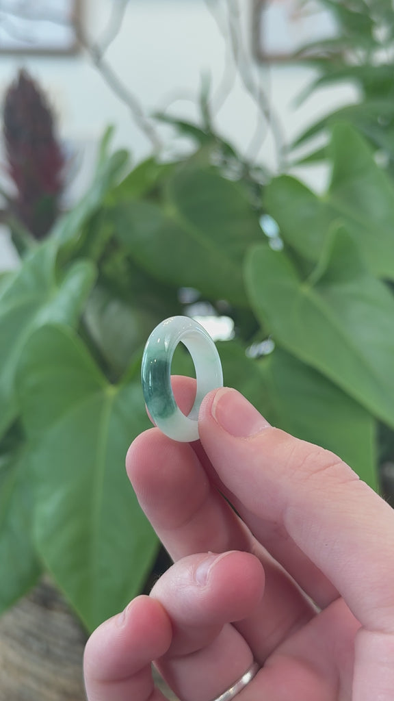 * DETAILS--- This ring is crafted from high-quality genuine Burmese blue-green jadeite jade, featuring a smooth, icy texture with a stunning blend of blue and green hues. Designed in a classic half-round style, it resembles a sleek jade bangle for your finger, with natural green patches adding to its unique charm. A timeless and meaningful gift for both men and women.