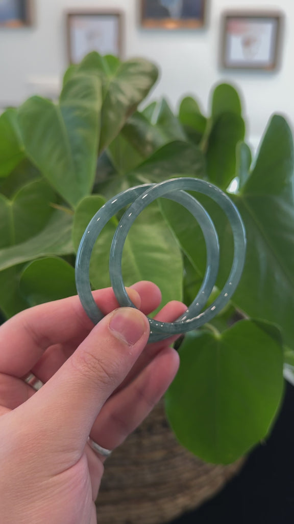 * DETAILS--- Genuine Guatemalan Jadeite Jade Bangle Bracelet. This bangle is made with genuine Ice Guatemalan blue green Jadeite jade, The jade texture is so smooth with blue color. The blue color, smooth clean texture, and the Classic round petite style. looks very cute. just has little bit clouds spot, It's a special gift for yourself or your love. ( Similar items sent random. )